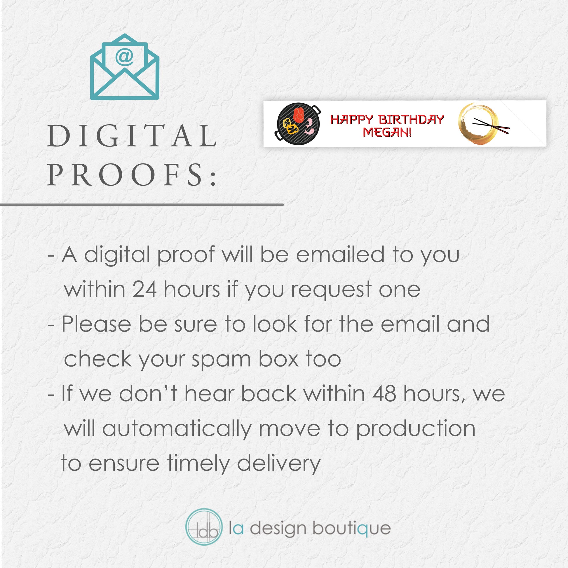 A digital proof will be emailed to you from aquach@ladesignboutique.com within 24 hours for personalized items if you request it. Please keep a lookout for an email from me and approve the proof immediately to ensure timely delivery of your product. If I do not hear back from you within 48 hours, I will automatically move to production to ensure timely delivery.