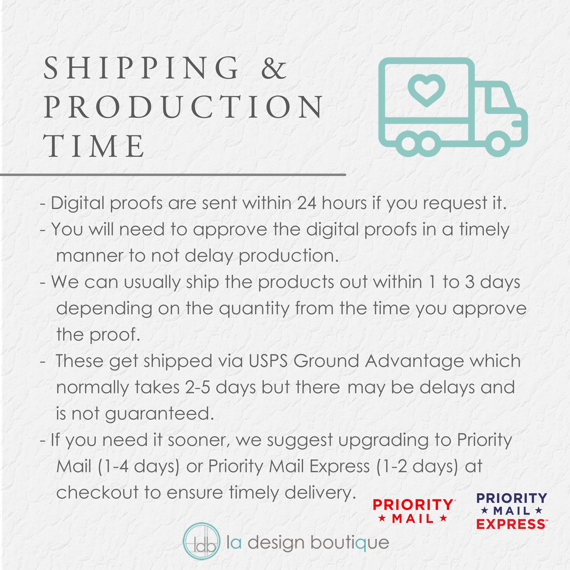 A digital proof will be emailed to you from aquach@ladesignboutique.com within 24 hours for personalized items if you request it. Please keep a lookout for an email from me and approve the proof immediately to ensure timely delivery of your product. If I do not hear back from you within 48 hours, I will automatically move to production to ensure timely delivery.